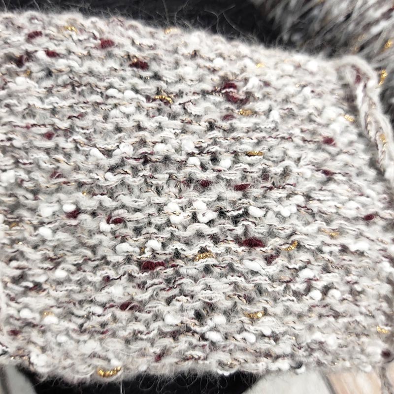Состав: фасонный меринос, меринос с люрексом, "шишечки" на полиамиде, вспушенная бэби альпака с мериносом, бэби альпака букле (20% па), смесовка с мохером и шерстью (70% па)